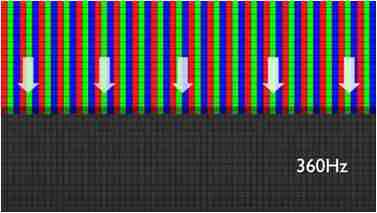 传统液晶驱动是从左到右单向进行,,,,在画面更新速度愈来越愈快的情况下,,,位于驱动线路末端的右下角区域,,画素的闸极来不及在短时间内获得足够电压,,,无法显示出正确的颜色资讯。。。 |